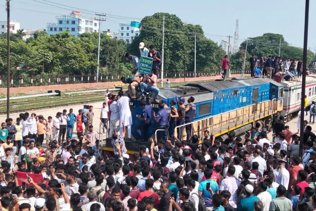 নোয়াখালী থেকে ঢাকাগামী আন্তঃনগর উপকূল এক্সপ্রেস ট্রেনটি ভৈরব রেলওয়ে স্টেশনে আটকে দেয় আন্দোলনকারীরা। এ সময় ট্রেনের ইঞ্জিনে উঠে বিক্ষোভ করতে থাকে তারা। বেলা সাড়ে ১১টার দিকে এক পুলিশ সদস্য ট্রেনটির ইঞ্জিন থেকে আন্দোলনকারীদের নেমে যেতে বললে বিক্ষোভকারীরা উত্তেজিত হয়ে ওঠেন।