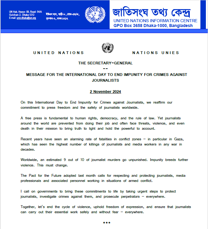 আন্তর্জাতিক সাংবাদিক নির্যাতন থেকে দায়মুক্তি অবসানের এই দিবসে আমরা বিশ্বজুড়ে গণমাধ্যমের স্বাধীনতা এবং সাংবাদিকদের নিরাপত্তা রক্ষার অঙ্গীকার পুনর্ব্যক্ত করছি।